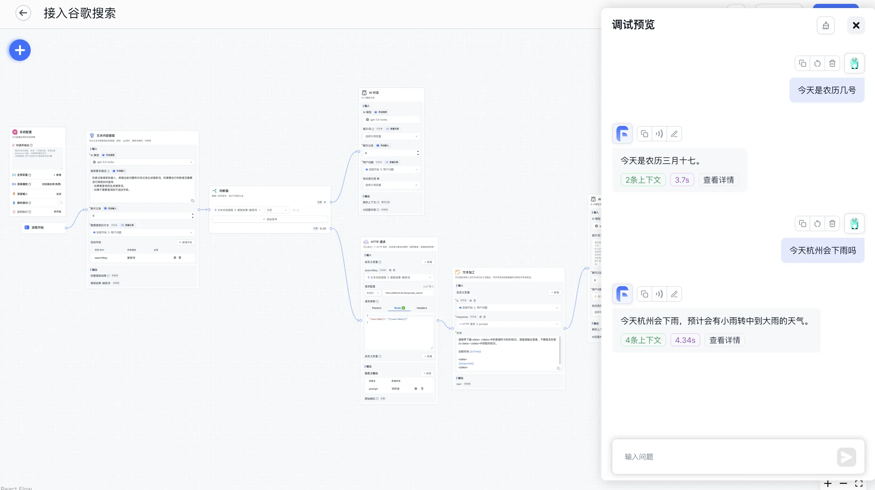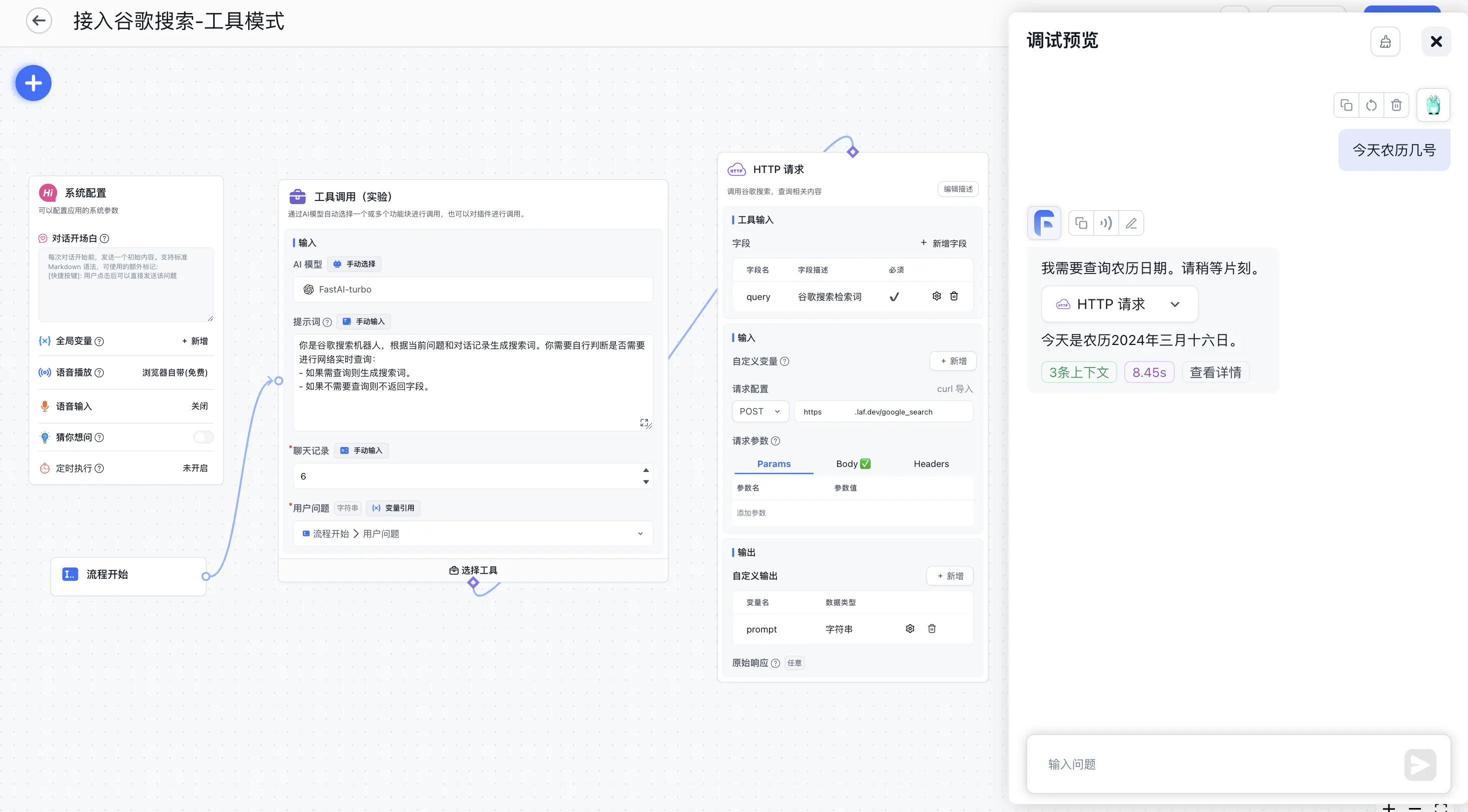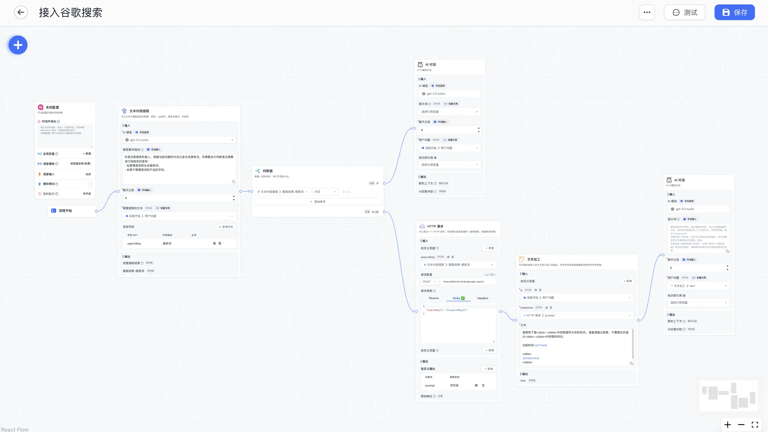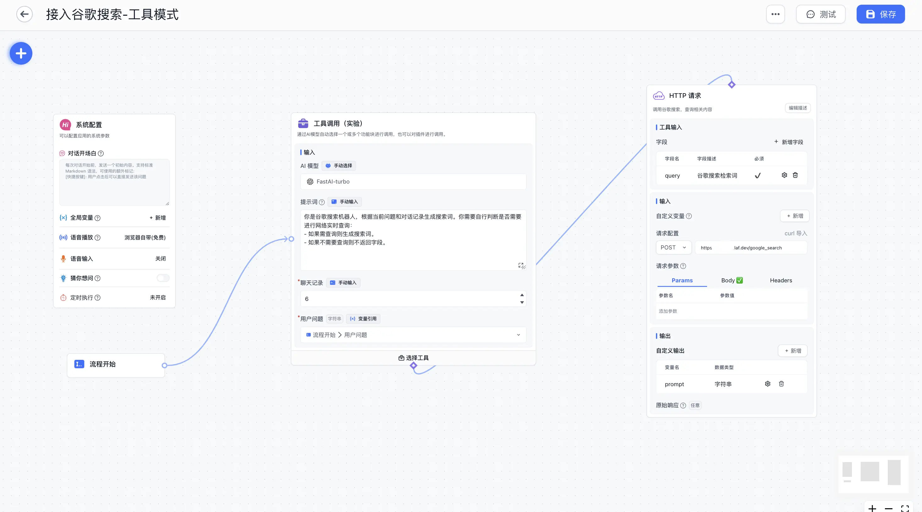 如上图,利用「HTTP请求」模块,你可以外接一个搜索引擎作为 AI 回复的参考资料。这里以调用 Google Search API 为例。注意:本文主要是为了介绍 「HTTP请求」模块,具体的搜索效果需要依赖提示词和搜索引擎,尤其是【搜索引擎】,简单的搜索引擎无法获取更详细的内容,这部分可能需要更多的调试。